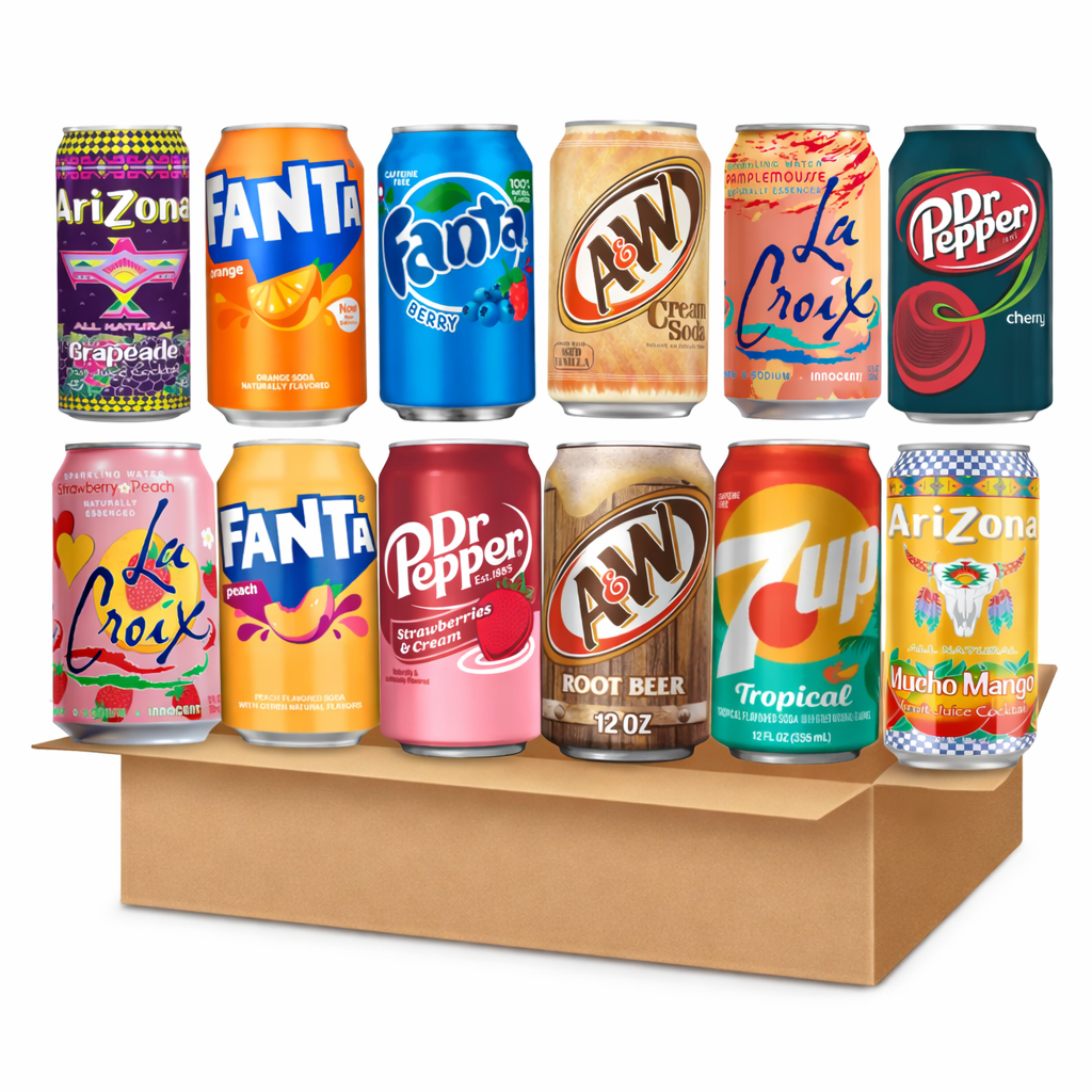 Enjoy a handpicked selection of 12 popular American soft drinks in one convenient bundle. This mixed drinks pack includes well-known favourites such as Fanta, La Croix, Dr Pepper, Arizona Iced Tea, A&W and other similar branded American beverages.
