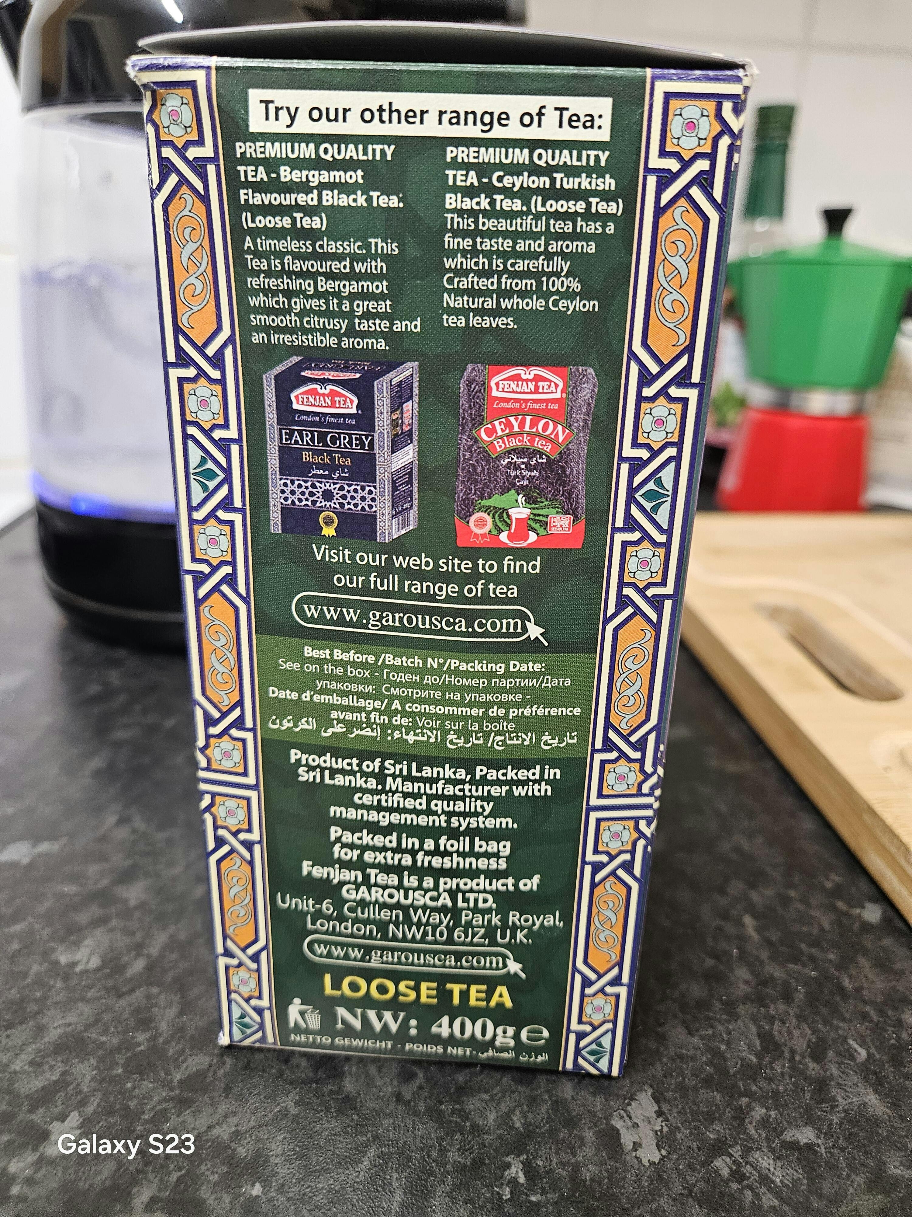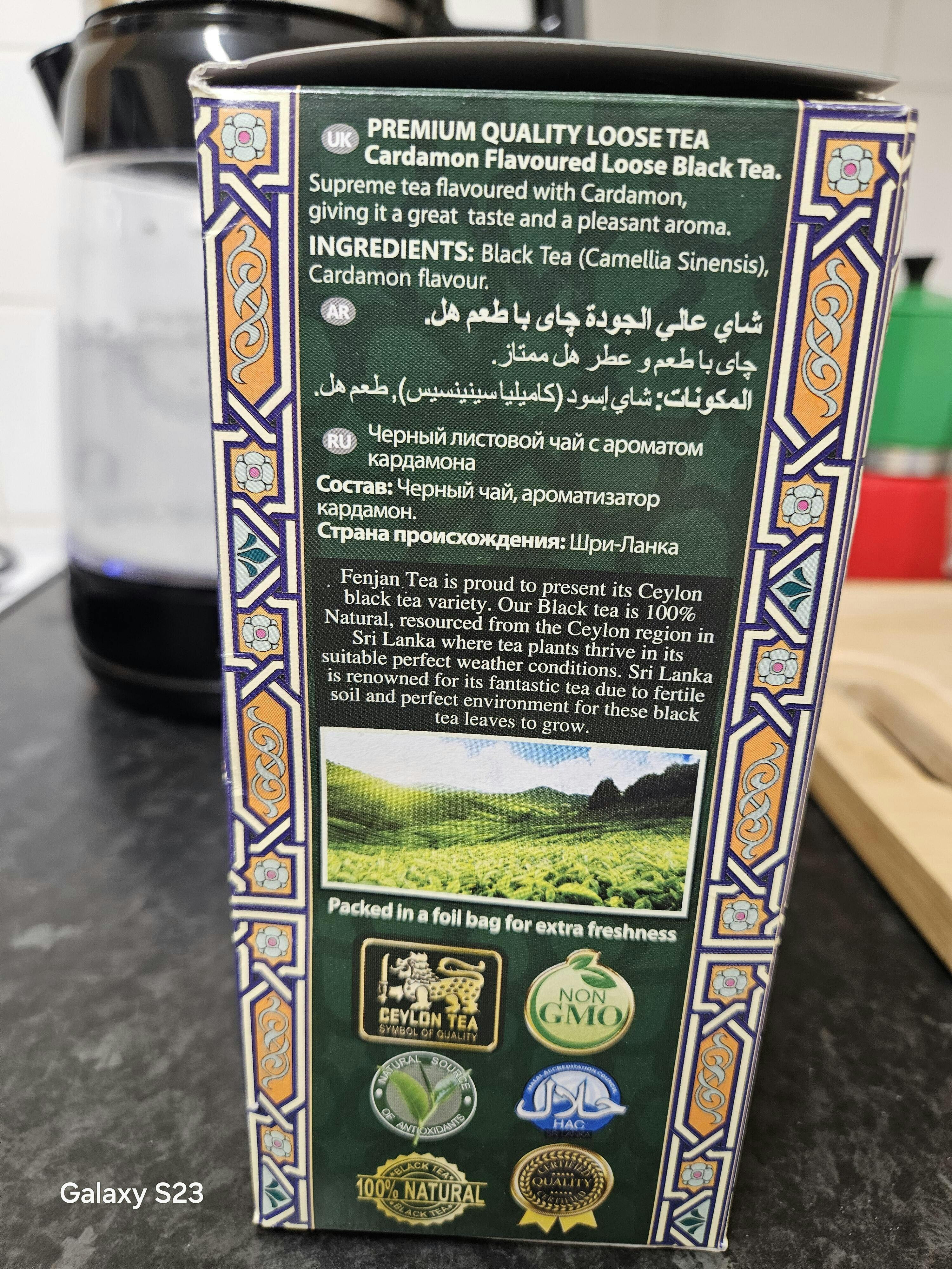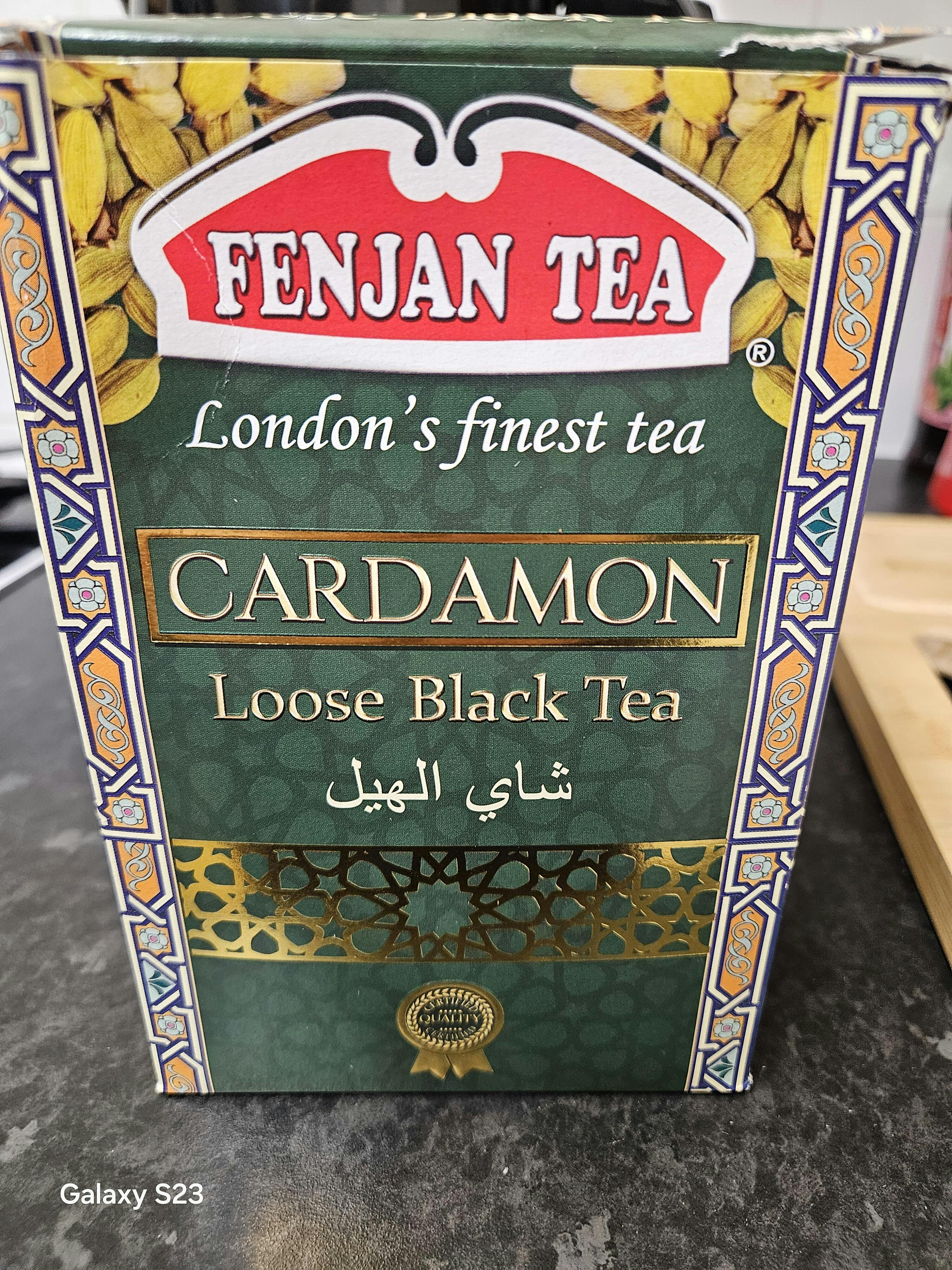Fenjan Tea Cardamom Black Tea is a premium blend of rich black tea infused with the warm, aromatic essence of natural cardamom. This carefully crafted tea delivers a smooth, full-bodied flavor with a hint of spice, making it the perfect choice for a refreshing and invigorating beverage. Whether enjoyed plain, with milk, or sweetened with honey, this tea offers a delightful balance of boldness and warmth in every sip.