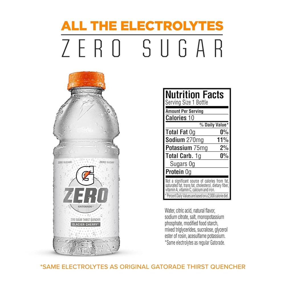 Rehydrate and recharge without the sugar! Gatorade ZERO Sugar Cherry delivers the legendary hydration performance you expect from Gatorade, but with zero sugar and minimal calories. Specifically formulated for those who are active and health-conscious, this sports drink features a bold, refreshing cherry flavor that hits the spot during a tough workout, a long workday, or a busy afternoon.