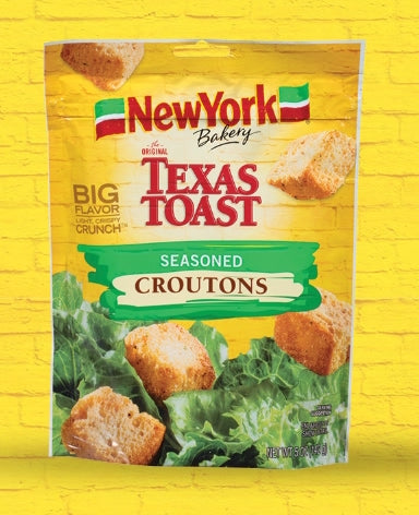 Add the ultimate, savory crunch to your meals with New York Bakery Texas Toast Croutons! This 142g bag is packed with extra-large, robust croutons cut from real, thick-sliced Texas Toast. Each crouton is baked to a perfect golden crisp and generously seasoned with a classic, savory blend of herbs and spices for a universally loved seasoned flavor. These hearty croutons are the perfect upgrade for any salad, soup, or chili, delivering an irresistible texture and authentic homemade taste.